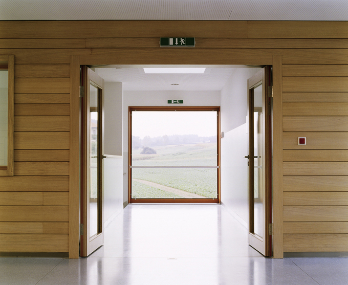 Die Klassen selbst haben mit Ausnahme eines tief sitzenden erkerartigen Fensters, das in seiner liegenden Form „nur“ kindgerecht ist, keinen direkten Ausblick in die Landschaft. Diese Introvertiertheit befremdet erst einmal, wenn man die Entwurfsmotive der Architekten gelesen hat und zudem Städter ist. Eine Erklärung bringen die sich mit dem Pausenzeichen in den lichtdurchfluteten kleinen Hallen verteilenden Kinder. Die Geschlossenheit der Klassen bedeutet Konzentration, die Helligkeit und Durchlässigkeit der Pausenräume als Kontrast dazu Entspannung, Bewegung und Ausschau.