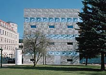 Überzeugt der Klinkerbau vor allem durch seine urbanistischen Qualitäten, so will die Bibliothek als der öffentlichste Bau des Campus mit ihrer Andersartigkeit die Aufmerksamkeit auf sich lenken: Zur Stadt hin ist sie ein introvertierter, nur durch horizontale Fensterschlitze und Oberlichtbänder strukturierter Kubus, der eine gewisse formale Ähnlichkeit mit den Studentenhäusern der beiden Basler in Dijon aufweist. Allerdings wird in Eberswalde die Architektur durch die Bildfassaden in den Hintergrund gerückt: Denn die von Thomas Ruff ausgewählten Fotos, die - in einer Art Siebdruckverfahren auf Glas- und Betonplatten übertragen - den Baukörper in seriellen Bahnen umziehen, entmaterialisieren das Gebäude fast.