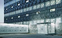 Überzeugt der Klinkerbau vor allem durch seine urbanistischen Qualitäten, so will die Bibliothek als der öffentlichste Bau des Campus mit ihrer Andersartigkeit die Aufmerksamkeit auf sich lenken: Zur Stadt hin ist sie ein introvertierter, nur durch horizontale Fensterschlitze und Oberlichtbänder strukturierter Kubus, der eine gewisse formale Ähnlichkeit mit den Studentenhäusern der beiden Basler in Dijon aufweist. Allerdings wird in Eberswalde die Architektur durch die Bildfassaden in den Hintergrund gerückt: Denn die von Thomas Ruff ausgewählten Fotos, die - in einer Art Siebdruckverfahren auf Glas- und Betonplatten übertragen - den Baukörper in seriellen Bahnen umziehen, entmaterialisieren das Gebäude fast.