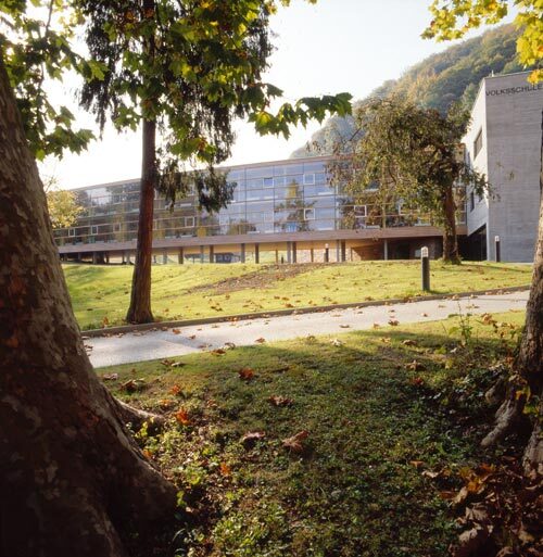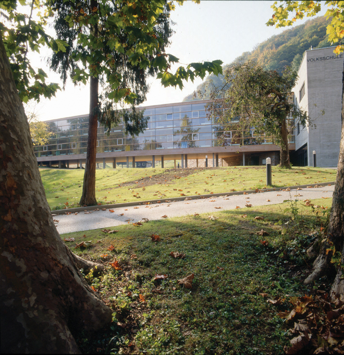 Wichtiger Entwurfsaspekt für die Volksschule war es, die Offenheit des Grundstücks zu bewahren und keine optischen Barrieren zu schaffen, sondern Blickbezüge in alle Richtungen zuzulassen. Daher wurde der östliche Teil des Baukörpers aufgeständert, der westliche hingegen sitzt zweigeschossig auf einem massiven, halb eingegrabenen Untergeschoss, in dem Turnsäle und entsprechende Nebenräume untergebracht sind. Erschlossen wird das Gebäude über einen leicht aus der Achse gedrehten Stiegenhauskubus, der wie ein Gelenk den Baukörper in Längsrichtung teilt bzw. die Funktionen spiegelt und von dem aus ein Gang an der Südfassade die östliche, ein Gang an der Nordseite hingegen die westliche Hälfte des Hauses auf kurzen Wegen erschließt. Diese Teilung setzt sich auch formal fort, je nach Nutzung und Ausrichtung ergeben sich an den Gebäudelängsseiten vier verschiedene Fassadengestaltungen: die Gangbereiche sind jeweils verglast, an der Südseite mit Holzlamellen als Sonnenschutz versehen, die regulären Klassenräume haben eine lebhafte Lochfassade, die Funktionsräume hingegen eine strenge, regelmäßige Fensteranordnung.