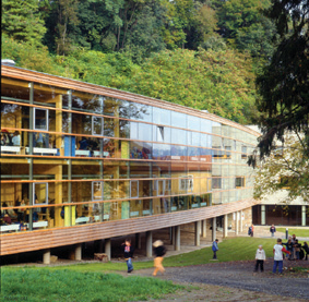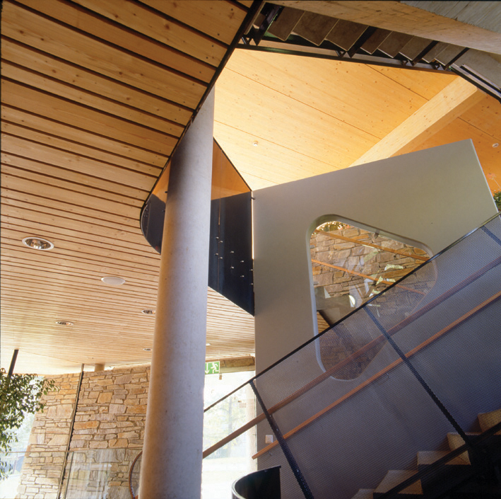 Eine ebenso große Herausforderung war es, die Decken schalltechnisch in den Griff zu bekommen, ohne auf deren Holzuntersicht verzichten zu müssen und auch ohne Estriche zu verwenden, um einen reinen Holzaufbau zu realisieren. Dabei kam die Höhe der Brettstapeldecken, die statisch ohnehin gefordert war, diesen Wünschen sehr entgegen. Auch hier fehlten jedoch Erfahrungswerte und Messungen, von industrieller Seite wurde den Planern unbedingt nahegelegt, abgehängte Akustikdecken einzusetzen. Schließlich entschied man sich in Absprache mit dem beteiligten Bauphysiker dafür, über den Holzdecken eine Splittschicht zur Erhöhung der Masse, zwei Lagen Trittschalldämmplatten und kreuzweise verleimte Spanplatten zu verlegen. Der Fußbodenbelag in den Klassenzimmern ist Massivparkett, in den Gängen Linoleum. Von außen kann man sehen, wie die Stirnseiten der Brettstapeldecken an die Gangfassaden heranreichen, der Kontrast zwischen Glas und massiver Holzdecke ist hier besonders reizvoll.