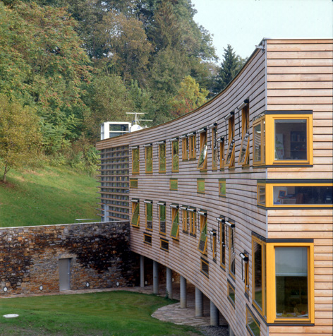 Die Volksschule von Wildon funktioniert – mit geringen Unterschieden – nach dem gleichen, sichtbaren Konstruktionsprinzip wie Karl-Morre in Graz. In einem massiven Sichtbeton-Stirngebäude befinden sich Turnsaal und Funktionsräume der Schule, der zweigeschossige, schwebende Klassentrakt ist eine einhüftig erschlossene Holzkonstruktion mit transparentem, straßenseitigem Gangbereich und zum bewaldeten Berghang orientierten Klassenräumen, deren Fensterfassade mit unbehandeltem Lärchenholz verschalt wurde. Der Holzbaukörper ist über seine gesamte Länge parallel zur Bergflanke gekrümmt, der dadurch verkürzte Klassenteil überragt daher den Gangbreich am Ende des Gebäudes. Im Unterschied zu Graz konnten aufgrund geringerer Lasten sowohl die tragenden Klassentrennwände als auch die Brettstapeldecken geringer dimensioniert werden. Trotzdem gelang es, die Schallschutzanforderungen einzuhalten. Verbesserungen gab es im Bereich der Längsfugen zwischen den einzelnen klh-Platten, die zusätzlich silikoniert wurden, sowie im Anschluss zwischen Klassen- und Außenwand, um Längsschallwege zu vermeiden. Auch bei den Geschossdecken konnten Anschluss-Details optimiert werden.