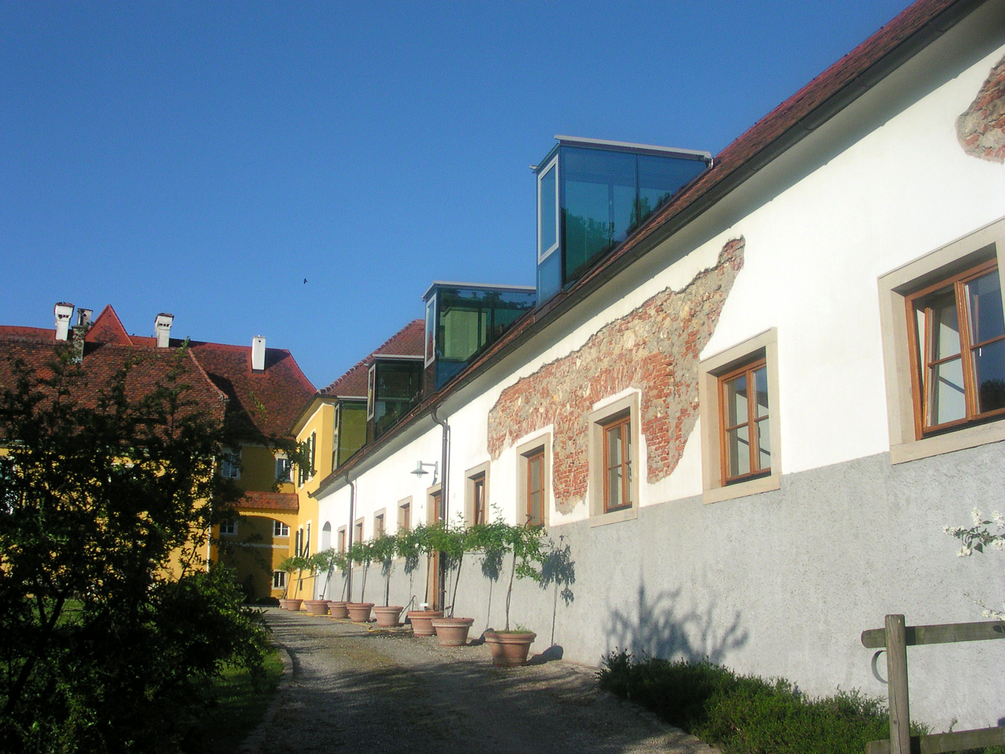 Auf Schloss Eybesfeld in der kleinen südsteirischen Ortschaft Jöß nahe Leibnitz hat Manfred Plottegg im Zuge einer umfassenden Adaptierung von landwirtschaftlichem Gebäudebestand einiges umsetzen können. Die ursprünglich barocke Anlage in einem weitläufigen Parkareal mit Fischteichen und einem jüngst initiierten zeitgenössischen Skulpturenpark wurde nach und nach saniert, revitalisiert und punktuell mit Neubauten ergänzt. Alle bis jetzt erfolgten baulichen Maßnahmen tragen die Handschrift des Architekten, wenn auch die Ausführung durch einen Generalplaner etliche Abweichungen vom Konzept aufweist.
