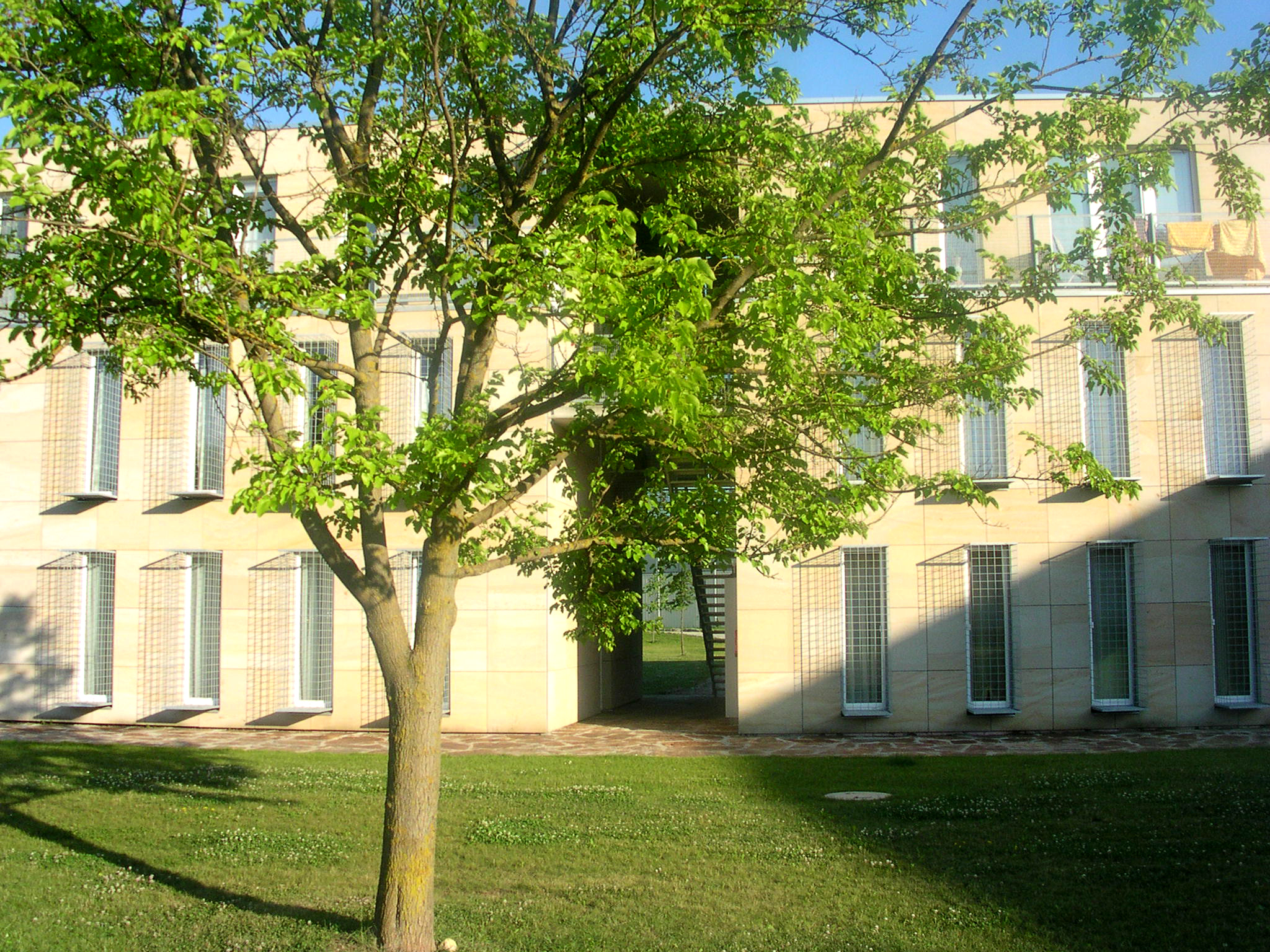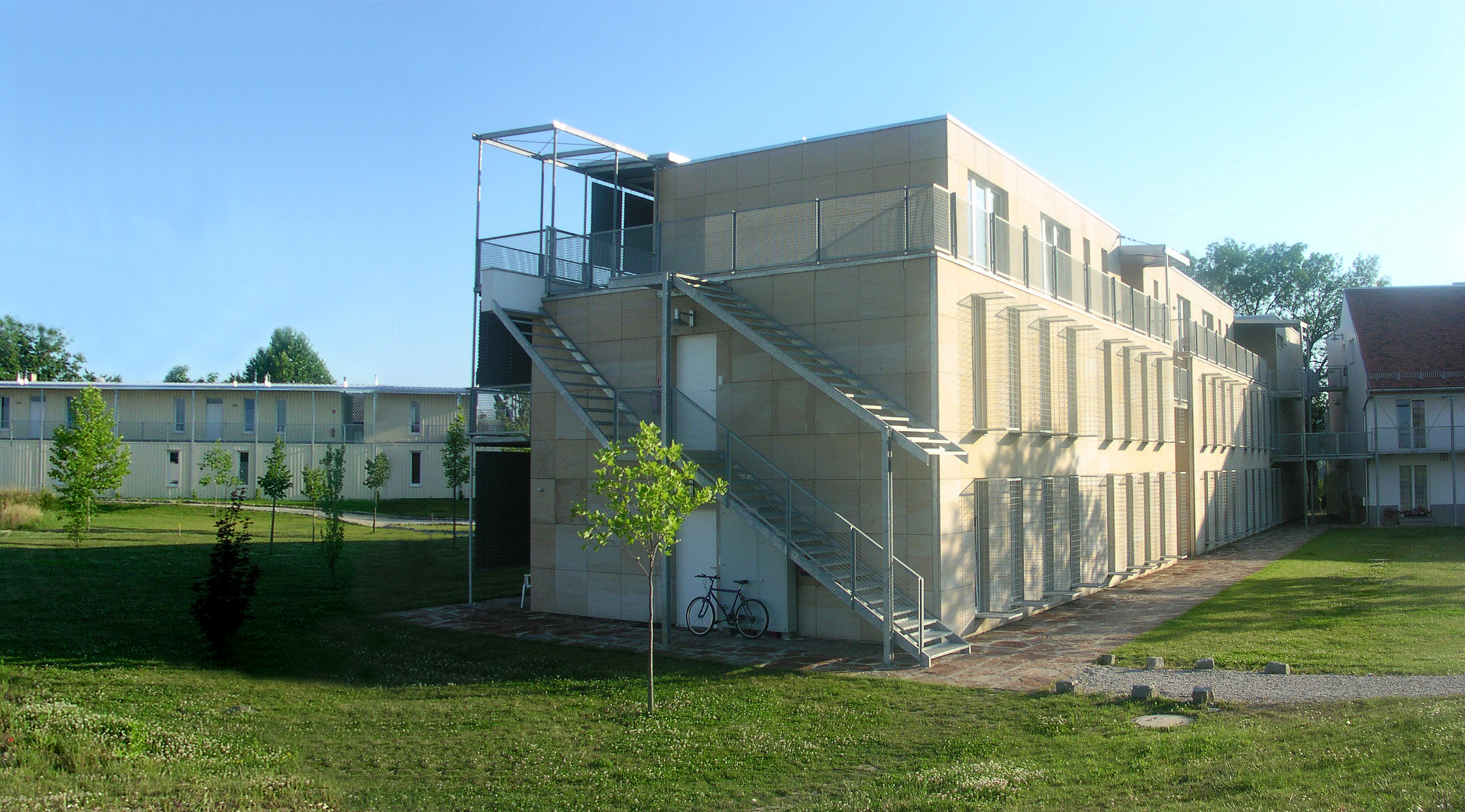 Ein kürzlich fertiggestellter zweigeschoßiger Riegelbau, der vom Eigentümer ob seiner üppigen Bepflanzung Glyzinienhaus genannt wird, bildet in linearem Zusammenspiel mit einem Erdwall das Tor zum Schlosspark. Auf beiden Längsseiten ist dem Bau eine etwa vier Meter tiefe Stahlkonstruktion vorgestellt – Treppen und Laubengang im Osten und eine umlaufende, offene Vorzone mit unterschiedlich großen, zugeordneten Balkonen auf der Westseite. Innerhalb der beiden Wohnungstrennwände treibt der Architekt den Reduktionsprozess der Grundrisse weiter. Nur die Sanitärräume sind als abgeschlossenes Element räumlich determiniert. Die Verweigerung detaillierter Funktionszuordnung zielt darauf, die Flächen bei Nachfrage auch anders genützt, etwa als Büros vermieten zu können. Auch das ist Nachhaltigkeit im Bauen: auf vielfältige Nutzung vorbereitet zu sein.