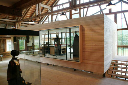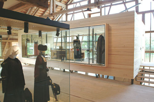 Dem Anliegen des Trachtenverbands nach einem ganzjährig nutzbaren Platz für Nähkurse entsprach der Architekt mit einem frei eingestellten, wärmegedämmten und abgeschlossenen »Raum im Raum«. Großzügige, mit Edelstahlhaltern geklemmte Isolier-Verglasungen an den Längsseiten machen ihn selbst zur Vitrine für die Schaustücke im Inneren.