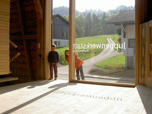 Die Geschlossenheit von holzverkleidetem Speicher- und Wirtschaftsgebäude ist eine der morphologischen Grundkonstanten vieler bäuerlicher Traditionslandschaften. Die Neunutzung der Tenne eines Bregenzerwälderhauses als Schauwerkstatt und Präsentationsraum für ein Trachtenfärbemuseum verlangt aber nach Licht und Öffnung. Beim unbefriedigenden Versuch, in den geschlossenen Baukörper des Tennengebäudes Fensteröffnungen einzuschneiden, entstand die Idee, die gesamte Giebelseite in eine homogene Glasfront zu verwandeln. Große Strukturglastafeln in esg-Qualität im Format von 200 x 76 cm wurden schließlich als zartes Glaskleid über die kräftigen Versalien historischer Zimmermannskunst gespannt. Eine wohlgesetzte Hausbeschriftung führt diese grafisch lineare Anmutung logisch weiter.