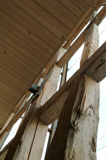 Diese eingestellte warme Stube übernimmt auch für die Fassade eine wichtige Funktion. Decke und Boden steifen über massive, aber diskrete Stahlflansche die Holzkonstruktion der Giebelwand so aus, dass die daran befestigte Glasfassade nur minimalen Verformungen ausgesetzt ist, denn selbst die massiven Querschnitte der historischen Zimmermannskonstruktion waren insgesamt für den Glasbau zu weich. Rudolf Meier bestand sogar auf einem geprüften Nachweis der maximalen Durchbiegung für die neue Konstruktion.