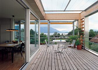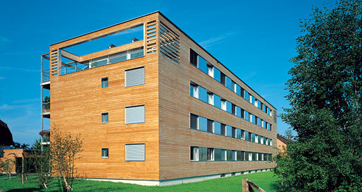 Brandschutz: Seit dem 1. Januar 2005 dürfen in der Schweiz Wohnhäuser aus Holz sechs statt vorher zwei Geschosse hoch gebaut werden. Bei dem Haus in Zug haben die Architekten und Ingenieure bereits in der Wettbewerbsphase mit der kantonalen Gebäudeversicherung zusammengearbeitet und ein projektbezogenes Brandschutzkonzept aufgestellt: