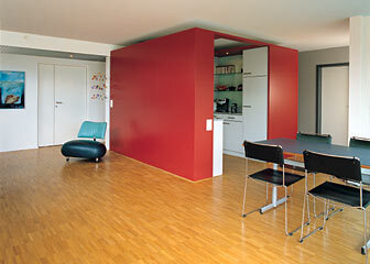 Um den Schallschutzanforderungen der Norm sia 181 (Schweizerischer Ingenieur- und Architektenverein, Schallschutz im Hochbau) gerecht zu werden, reichte bei den nicht tragenden Wohnungstrennwänden eine Metallständerkonstruktion mit doppelter Gipskartonschale. Bei den Decken bediente man sich eines noch relativ neuen Systems: einer Holz-Beton-Verbunddecke. Der Verbund besteht aus Brettstapelelementen, deren stehende Lamellen abwechselnd 100 und 120mm hoch sind, und einer ebenso starken, vor Ort eingebrachten Betonschicht. Diese 220mm dicke Rohbaudecke wurde unten mit zwei Gipskartonplatten verkleidet. Auf dem Beton liegt Trittschalldämmung, Trennfolie und Unterlagsboden, darauf im Wohnbereich Eichenparkett und in den Zimmern grüner Linoleum. Die sehr guten Schallschutzwerte, die während der Planung berechnet wurden, bestätigen die Bewohner nach dreijährigem Gebrauch: lediglich starker „Hackengang“ des oberen Nachbarn wird als störend empfunden.