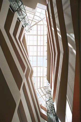 Im Erdgeschoß durchstößt die lange Eingangshalle den Baukörper ziemlich schräg in Fortsetzung der Vorfahrt. Nach dem häuschenartig gerahmten Windfang gelangt man in eine zwei Geschoße hohe Raumzone, wo das Empfangspult steht. Ein Steg, der den Raum quer überspannt, bildet eine kleine Zäsur, bevor man in den sechs Geschoße hohen, mit Glas überdeckten Lichthof hinaufblickt. Allein das Betreten des Gebäudes folgt somit einer räumlichen Dramaturgie, die einiges an starken Wirkungen bereithält.