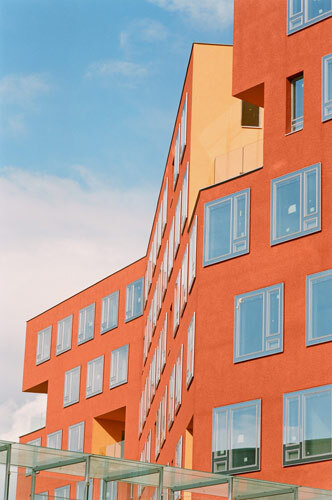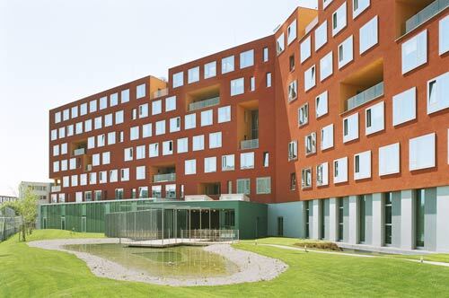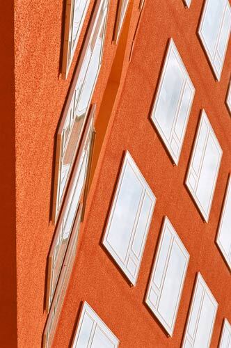 Irgendwo zwischen diesen Glastafeln tummeln sich in der Fassade große Loggien, die als orangene Löcher aus dem zackigen Ding ausgestanzt sind. Eckig, unregelmäßig, gelungenermaßen tatsächlich sehr zufällig, so als träumte der Architekt von der Quadratur des Emmentalers. Konsequenterweise haben Rüdiger Lainer und sein Partner Oliver Sterl - kraft geplanten Zufalls - dabei nicht einmal den unwahrscheinlichen Fall ausgeschlossen, in dem zwei orthogonale Käselöcher durch Berührung schließlich zusammenwachsen. Blob.
