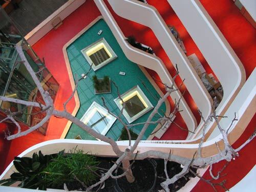 Die Gänge werden nie besonders lang, ohne dass sie von einer innen verglasten Loggia oder einer kleinen Ausweitung unterbrochen werden, und dort, wo die zwei Gänge eines Gebäudeflügels im spitzen Winkel wieder aufeinander treffen, weitet sich der Raum zur kleinen Ganghalle, in der Begegnungen weniger beengt ablaufen können. Nun wird man sich fragen, ob vor lauter Individualität nicht etwa die Orientierung verloren geht. Aber darüber braucht man sich bei der klaren Struktur der drei Gebäudeflügel und dem übersichtlichen Lichthof keine Sorgen zu machen. Zurechtfinden ist nicht schwer, und Identität geht vor kalter Funktionalität. Denn die Vielfalt und Differenziertheit dieser allgemeinen Räume zeugt von außerordentlicher Raumlust, der Freude, unterschiedlichste Räume und Raumzonen zu generieren und den darin Arbeitenden zur neugierigen und interpretierenden Benutzung anzubieten. Erste Anklänge zu dieser Art Raumfeuerwerk finden sich schon in Rüdiger Lainers frühen Wohnbauten. Die freie Form des Lichthofs wurde von ihm auch in der Mall des Kinocenters bei den Gasometern ausprobiert, aber hier in der Wirtschaftskammer ist die Form strengeren Gesetzen unterworfen und die Farbigkeit zurückgenommen.