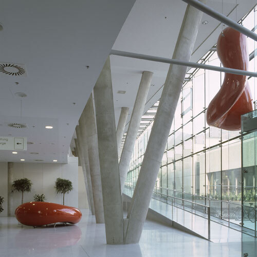 Man muß sich die funktionelle Organisation des Gebäudes so vorstellen: Es gibt die große, zentrale Erschließungshalle, links davon geht es zu den Ambulanzen. Und in den oberen Geschoßen sind im wesentlichen die verschiedenen Krankenstationen. Die Kreuzform der Gebäudekonfiguration wird an der Rückseite durch einen zweigeschoßigen Flügel hergestellt, der ausschließlich Ein- und Zweibettzimmer für Klassepatienten enthält, an der Vorderseite, auch als raumbildende Fassung des Vorplatzes, durch zwei niedrigere kubische Bauten, denen leuchtend gelbe, nahezu organisch geformte Körper aufgesetzt sind - sie enthalten die umfangreiche Technik, die heute im medizinischen Bereich gebraucht wird.