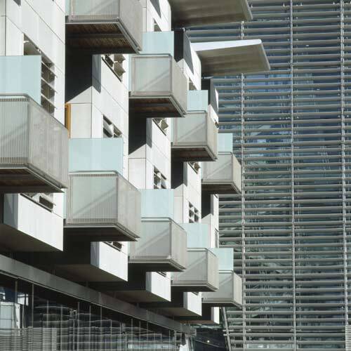 In diesen Bauteilen sind die Operationssäle und die Intensivstationen mit allem untergebracht, was an speziellen Einrichtungen dafür notwendig ist. Sie sind durch gläserne Brückenverbindungen mit dem Hauptriegel verbunden, sodaß die Wege innerhalb des Hauses trotz seiner Größe verhältnismäßig kurz bleiben. Und sie sind um eingeschnittene Höfe organisiert.