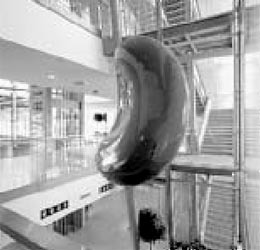 Egal welchen Zugang man wählt: Der Raumeindruck der Empfangs- und Erschließungshalle ist überwältigend. Durch die Glasfassade ist sie lichtdurchflutet, durch die innere Organisation großzügig. Gegenüber vom Haupteingang der Empfangsbereich, dahinter die Verwaltung; rechts vom Empfang eine Bankfiliale und ein Café mit großer Terrasse; links eine kleine Kapelle.