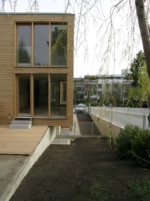 Eine Konzeptänderung innerhalb der langen Planungszeit aber darf nicht unerwähnt bleiben: Anstelle der zur Straße hin geplanten, ebenerdigen Ordinationen und Büros befinden sich hier nun zwei Wohnungen. Vier weitere erstrecken sich über das erste und zweite Obergeschoss. So ist aus der ursprünglich als Reihenhaus geplanten Anlage ein Geschosswohnbau geworden. Damit kamen auch andere baurechtliche Gesetze zur Geltung: Die Behörde forderte nun eine Fassade in B1, schwer brennbar. Anstelle der oft verwendeten Lärche musste für die Verschalung die teurere Eiche zum Einsatz kommen. Der mehrgeschossige, ebenfalls von Hubert Rieß in Holzbauweise errichtete Wohnbau in der Spöttelgasse in Wien-Floridsdorf, musste genau aus diesen Gründen, so der Architekt, verputzt werden.