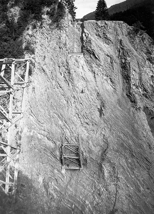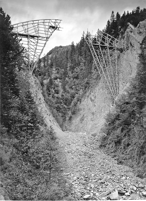 Im Jahr 1929 erhielt der bekannte Holzkonstrukteur und Unternehmer Richard Coray (1869 – 1946) den Auftrag zum Bau eines Lehrgerüsts für die hohe Schluchtüberquerung. Der damals 60-Jährige erstellte die Holzliste für das Transport- und Hauptgerüst, die 1285 Nummern für Kantholz bei einem Gesamtbedarf von 700 m³ umfasste. Auch half er noch beim Montageplan und bei Vermessungsarbeiten mit, übergab aber die weiteren Arbeiten seinem Sohn Richard. Der frisch diplomierte Bauingenieur zeichnete nach Angaben seines Vaters den Konstruktionsplan und führte die statische Berechnung durch.