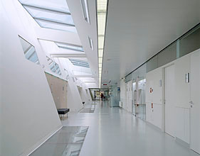 Überaus markant erhellt wird die Gangzone durch ein seitlich situiertes, hochgelegtes Oberlichtband, das die Lichtstrahlen auf eine ebenfalls stark geneigte Wand lenkt. Einerseits wird das Licht von der strahlend weißen Schräge in die verglasten Bereiche der Versorgungszone reflektiert, andererseits werden die innen liegenden Sanitärräume der Krankenzimmer hinter dieser Wand durch Ausnehmungen in dieser mit Tageslicht versorgt - in einem Maß, dass künstliches Licht tagsüber nicht gebraucht wird. Sogar die Gänge der ein Geschoß tiefer liegenden Stationen profitieren vom darüber einfallenden Licht, indem in regelmäßigem Abstand Glasstreifen in die Decken eingelassen sind.