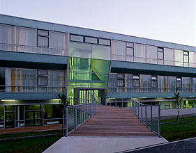 Entwurfsentscheidungen sind bei Hemma Fasch und Jakob Fuchs, die projektbezogen mit Lukas Schumacher zusammenarbeiten, immer von Pragmatik bestimmt. Auch wenn diese Aussage erstaunen mag: Sie sind, im besten Sinn des Wortes, anwendungs- und sachbezogen. Der Gefahr, allzu vertraute Bilder zu produzieren, unterliegen die Architekten dabei nie. Ihr „Anderssein“ ist keine gewollte Programmatik. Es ist die ihnen eigene, unkonventionell frische Umsetzung von Vorgaben - von solchen des Ortes, der Funktion bis zu jenen der gewählten Materialien -, die die Nutzer fordert und unreflektierte Gewohnheiten überdenken lässt. Auch das Dach über der Anlieferungszone zwischen Alt- und Neubau ist kein modisches Aperçu. Die luftgefüllten, transparenten Folienkissen wirken höchst ephemer und gewichtslos, lassen Licht ungehindert in die anschließenden Räume und sind kostengünstig. Ins rechte Licht rücken solche Bauten sich von selbst.