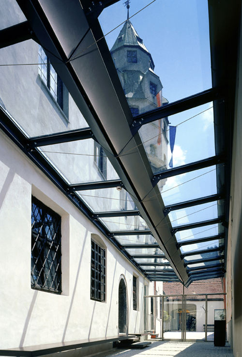 Ganz neu ist der Eingang: Er wurde in den Bestand eingeschnitten und mit weißem Glas verkleidet, ein großes Schaufenster bietet erste Informationen. Man sieht gleich den zentralen Ticketschalter und kommt in ein neues Foyer, das mit einfachsten Mitteln sehr transparent hergestellt wurde. Gratl hat den kleinen Burghof teilweise glasüberdacht, sodass der Blick auf die Architektur und die Atmosphäre der Hofsituation erhalten bleiben. Trotzdem ist es ein eindeutiger Innenraum (geheizt) und der Verteiler zu den verschiedenen funktionalen Räumen, den Garderoben etwa, die in der ehemaligen Esse untergebracht sind. Es war eine der Hauptaufgaben des Architekten, den Bestand zu entrümpeln und zu sanieren, einen modernen Museumsbetrieb zu ermöglichen und zugleich der alten Substanz noch zusätzliche, verwendbare Räume abzuringen.