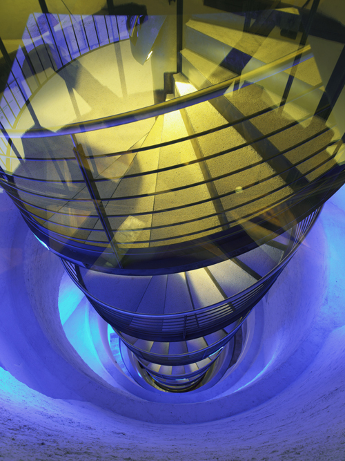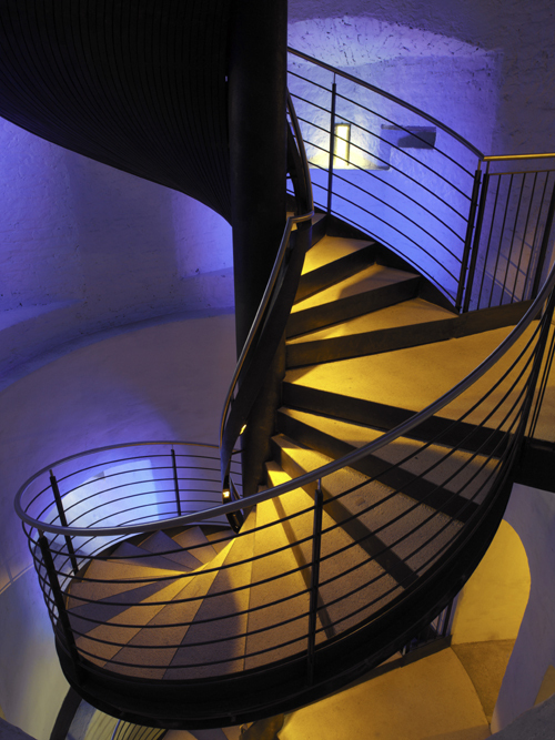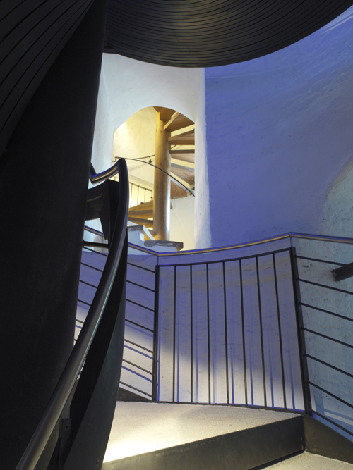 Es gibt einen architektonischen Höhepunkt beim Rundgang durch dieses Museum, das auch jeden Nicht-Numismatiker faszinieren wird: den alten, zweiläufigen „Münzerturm“ mit seinen 46 Metern Höhe, über dessen ursprüngliche Funktion sich die Historiker nicht ganz einig sind. Für einen Wehrturm ist er nämlich etwas aufwendig ausgeführt. Von der zweiläufigen Erschließung blieb die alte, sehr schmale, die bestenfalls Kindern Freude bereitet, erhalten. Die neue Haupterschließung - eine Wendeltreppe aus Stahl, der mit Grafitwachs eingelassen ist - hat Benedikt Gratl entworfen. Und sie ist wirklich ein skulpturales Highlight dieses ganzen Museums. Jedes Element dieser Treppe ist praktisch ein Prototyp, nicht nur aufgrund der Krümmung, sondern weil auch die Wände so unregelmäßig sind. An der Basis sind sie 2,84 Meter stark, nach oben werden sie dünner, und der Raum wird größer.