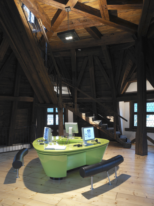 Der größte Mehrwert, den Gratl mit seiner Behandlung des Turmes erzielt hat, besteht wahrscheinlich darin, dass er ihn zwar in den Ausstellungsrundgang integriert, ihn aber nicht musealisiert. Der Turm stellt sich selbst aus. Gratl hat darauf verzichtet, hier irgendwelche Vitrinen zu platzieren oder die Wände voll zu hängen. Er hat sich darauf beschränkt, die Materialwirkung des alten Mauerwerks herauszuarbeiten und die alte Wendeltreppe so zu erhalten, dass sie auch visuell präsent bleibt. Und ganz oben ist dann nicht nur der Punkt, wo man den grandiosesten Ausblick hat, sondern auch eine Informationsplattform, in die man sich einklicken kann.