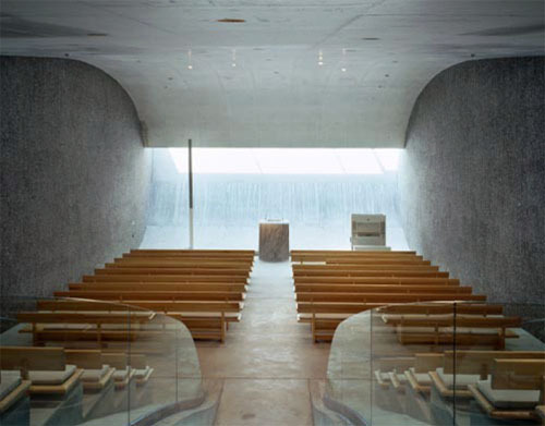 Eine Wegkirche, so wie bei Rudolf Schwarz (auch ein Gläubiger). Draussen beginnt der Weg auf dem ausgreifenden, kirchenbreiten Vorplatz, der sich wie ein erstarrter, breiter Betonstrom vom Eingang her leicht absteigend gegen die Ankommenden wälzt. Noch hat man das Gefühl, man gehe auf einen Ausstellungsraum zu, dann betritt man das dreiseitig raumhoch verglaste Foyer. Ein kühler Ort, wo man begrüsst, herumsteht und schwatzt. Doch man ist erst darunter, noch nicht drin, denn der auskragende Schwung des Vordachs (des Flaschenhalses?) fährt mit wuchtiger Eleganz über die Köpfe hinweg und stoppt mit einem schmalen, liegenden Fenster, das aber am Foyer keinen Anteil hat. Das Foyer ist auf seiner vierten Seite ausgerundet, die senkrechte Wand löst auf und geht mit einer Kurve vom Boden in die Decke über. Hier macht der Weg eine Pause und endet an einem schwungvollen Betonfels. Aber nur kurz, denn in der Gebäudeachse liegt der Durchlass zum Kirchenraum, eine Verengung und Kanalisierung. Die Stimmung ändert sich vom Profanen zum Sakralen, niemand schwatzt mehr. Im Zugangskanal wird es dämmrig, aber die Altarwand, auf die man geradeaus blickt, leuchtet als helles Band dem Besucher entgegen. Davor steht der blockhafte, hinterleuchtete Altar. Wie schon im Foyer geht der Boden in sanftem Schwung in die Altarwand über und sie verschwindet hinter der Deckenkante. Denn von oben senkt sich die Decke dem Altar entgegen und zwischen Wand und Decke bleibt ein Abstand, in dem auf die ganze Raumbreite ein unsichtbares Oberlicht sitzt. Die Altarwand wird mit Streiflicht aus einer verborgenen Quelle belichtet, ein altes barockes Verfahren.