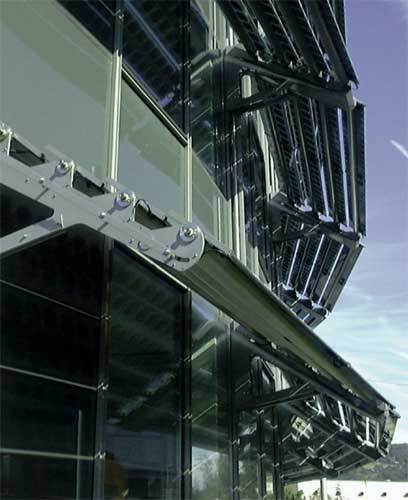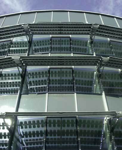 Felder der Fotovoltaik-Anlage abgestimmt auf die Fassadenteilung.