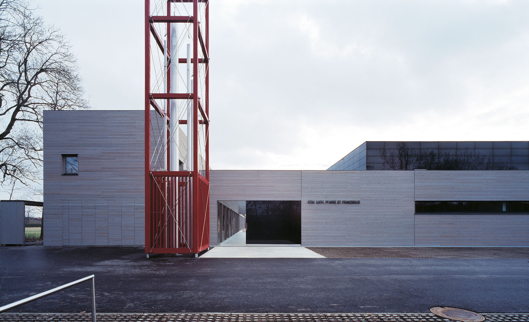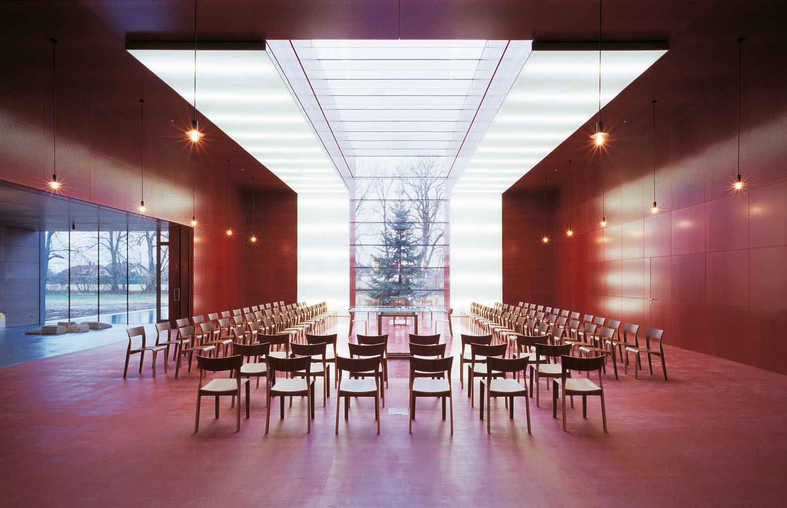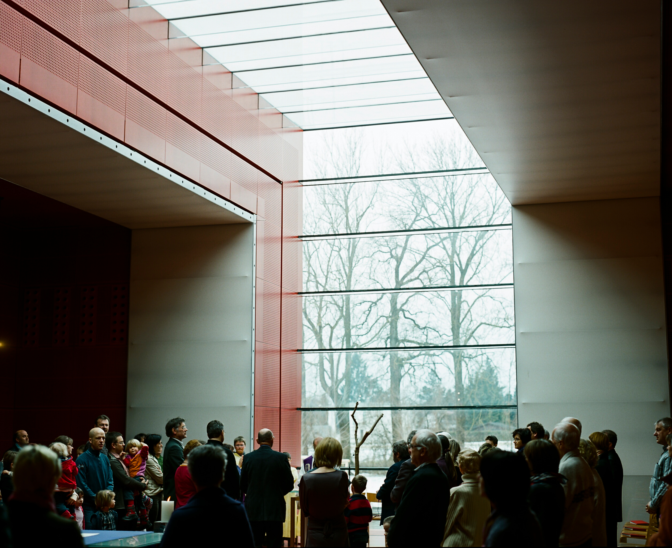 Der Altarraum in der Pfarre St. Franziskus ist zur Gänze in Rot gehalten, das moderne Taufbecken wird von einem Brunnen gespeist. Gefeiert wird im Übrigen sozusagen unter freiem Himmel: ein rund vier Meter breiter und 13 Meter langer verglaster Einschnitt über die Westwand und das Dach öffnen den Raum nach außen.