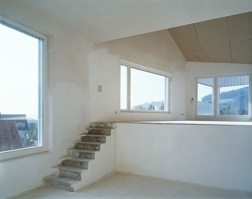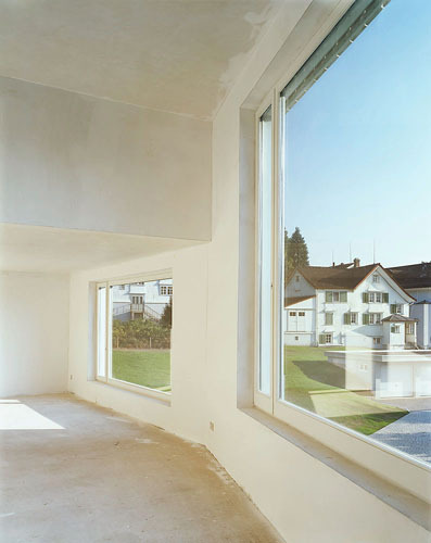 Im Dorfkern von Teufen gibt es schöne Appenzellerhäuser und Fabrikantenhäuser zeugen von der Weberei und dem Textilhandel. Wenig unterhalb des Bahnhofs haben die Architekten Covas Hunkeler Wyss im engen Korsett, das ihnen eine Zivilschutzanlage und die Grenzabstände vorgaben, ein Haus mit sechs Wohnungen errichtet. Die geknickten Fassaden und das gefaltete Dach brechen die grosse Form und nehmen den Massstab der Umgebung auf. Die Architekten interpretierten traditionelle Elemente auf eine frische Art. Dies zeigt sich bei der Dachlandschaft, die ein Motiv der zusammengebauten Altbauten der Umgebung zeigt, aber auch bei der hölzernen Fassade und den Fenstern, die sich teilweise mit Schiebeläden schliessen lassen. Die unterschiedlichen Fenster weisen darauf hin, dass sich unter dem Dach nicht einfach cremeschnittenartig aufeinander gestapelte Geschosse befinden. Jede der sechs Wohnungen besitzt einen überhohen Wohnraum und in der einen Dachwohnung scheinen die Winkel und Treppen kein Ende zu nehmen, bis man schliesslich die prächtige Dachterrasse erreicht. Rechte Winkel gibt es im Grundriss kaum und wer den Schnitt sieht, der staunt, dass am Ende alles zusammenpasste.
