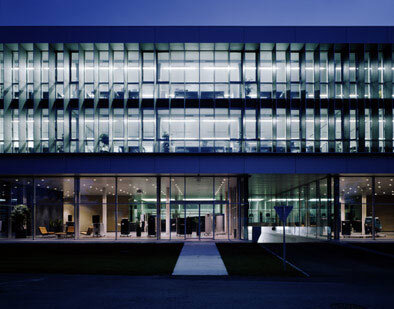 Im jetzt fertig gestellten zweiten Bauabschnitt bildet der Verwaltungstrakt die Randbebauung zum Ried und erlaubt den Mitarbeitern einen ungehinderten Blick in den angrenzenden Naturraum. Die knapp 90 Meter langen und 18 Meter tiefen Großraumbüros sind durch und durch rationalistisch: weiße Wände und Säulen, grauer Teppichboden, eine Decke aus Metallpaneelen und graues Mobiliar. Nur der Blick in die Landschaft relativiert diesen calvinistisch-nüchternen Eindruck. Steinmayr verwendet hier vertikale Aluminiumpaneele, die er als „Bretter“ bezeichnet, zur Gliederung der Fassade und zur Vermeidung von Erwärmung und Blendung im Inneren. Die nach Osten orientierte, raumhohe Glaswand ist dadurch gut vor der Sonne geschützt, sodass die Mitarbeiter auf zusätzliche, den Ausblick störende Beschattungen verzichten können. An der südlichen Schmalseite des Verwaltungstraktes, wo die Sonne in steilerem Winkel einfällt, erfolgt die Beschattung dagegen mit horizontalen Gitterrosten.