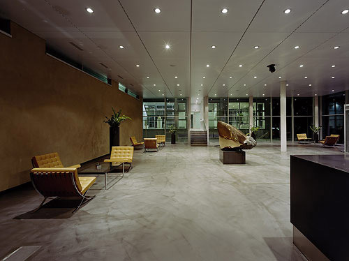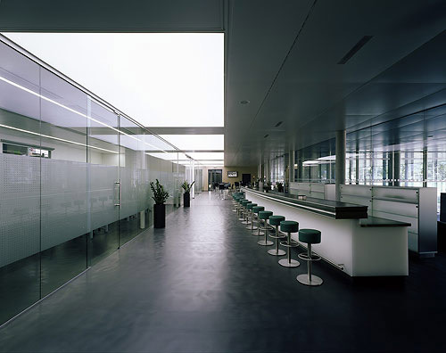 Auf Wunsch des Bauherrn finden sich in der zweiten Ausbaustufe im Erdgeschoß, einem aktuellen Trend folgend, Wände mit Lehmoberfläche. Dieses Material gibt dem Eingangsbereich und dem Ausstellungs- und Veranstaltungszentrum einen erdigen Charakter - ein effektvoller Kontrast zur kühlen Rationalität des sonstigen Gebäudes. Die eigentliche Überwindung des rein Rationalen findet jedoch auf einer subtileren Ebene statt, wenn die kühle Maschinenästhetik durch Lichtführung, Proportion und feine Abstufungen von Material und Oberflächen zum Schwingen gebracht wird. Erst dadurch wird dieser Industriebau zur Baukunst. Er unterscheidet sich deutlich von vielen schön in Glas und Aluminium verpackten Industriebauten, die nur verkleiden, sich der Zerreißprobe zwischen künstlerischer Freiheit und ökonomischen Sachzwängen aber nicht auszusetzen wagen.