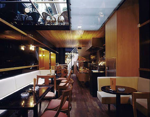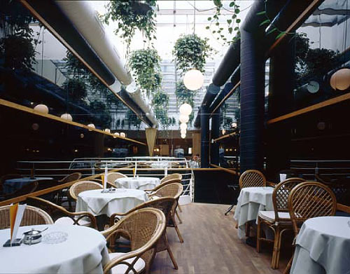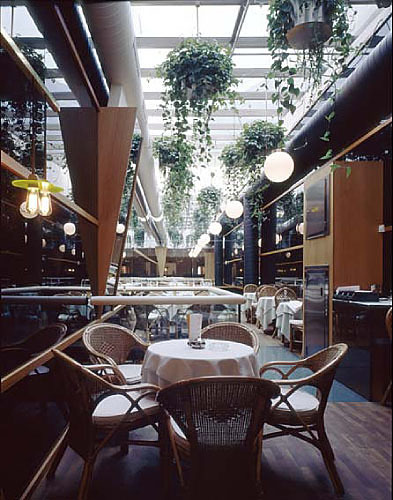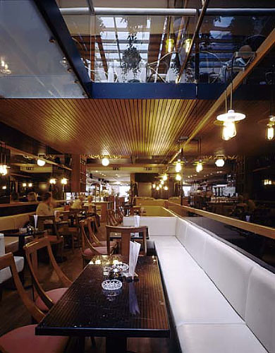 Ungewöhnlich ist vor allem, dass das Konzept des Architekten einen Rundumgang durch die beiden Ebenen des Lokals ermöglicht. Man geht unten hinein, in die Tiefe und kann dort ins Obergeschoß hinauf-, zurück- und wieder hinuntergehen. Sicher wurde diese Lösung erst durch die räumlichen Zwänge suggeriert. Aber sie macht aus der Platznot in der Breite eine Tugend: Köberl schlägt den Gästen einen Einbahnverkehr vor, sie brauchen nicht umzudrehen und wieder an den selben besetzten Tischen vorüberzugehen, die sie gerade passiert haben.