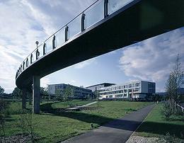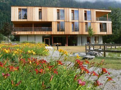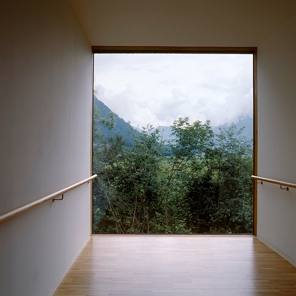 Hortschüler kommen täglich zum Mittagessen, der Ortsgottesdienst wird fallweise in der hauseigenen Kapelle abgehalten, und die Einrichtung der örtlichen Bibliothek im Haus ist geplant. Das Bauwerk präsentiert sich als kompaktes Volumen mit Anmut und Leichtigkeit. Hermetisch und schwer wirkt nur die zur Straße gewandte Nordseite, die sparsam Einblicke gewährt, weil sich hinter ihren Lamellen Pflege- und Verwaltungseinrichtungen verbergen. Und doch entsteht der Eindruck eines schwebenden Baukörpers nicht nur, weil der dem betonierten Sockelgeschoß aufgesetzte Holzbau allseitig auskragt, sondern auch, weil der Architekt es verstand, drei der Fassaden mit einer spielerischen, dabei präzisen Setzung großzügig verglaster Öffnungen und mehrerer raumtiefer Einschnitte für Loggien durchlässig und leicht wirken zu lassen.