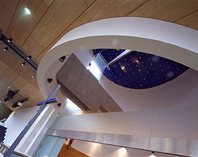 Sie entwarfen einen im Grundriss elliptischen reifförmigen Baukörper, wo sich über einer massiven Sockelzone eine Holzrahmenkonstruktion erhebt, die, wie aufgefaltet wirkend, unterschiedliche Raumqualitäten entwickelt: Geschlossen und verglast einerseits, bildet sie den eigentlichen Kirchenraum unten an der Straße, als überdachter, aber offener Umgang andererseits schafft sie gleichzeitig die Anbindung an die historische Bausubstanz am oberen Niveau und schließt diese schwungvoll mit ein.