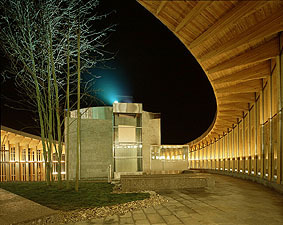 Sie entwarfen einen im Grundriss elliptischen reifförmigen Baukörper, wo sich über einer massiven Sockelzone eine Holzrahmenkonstruktion erhebt, die, wie aufgefaltet wirkend, unterschiedliche Raumqualitäten entwickelt: Geschlossen und verglast einerseits, bildet sie den eigentlichen Kirchenraum unten an der Straße, als überdachter, aber offener Umgang andererseits schafft sie gleichzeitig die Anbindung an die historische Bausubstanz am oberen Niveau und schließt diese schwungvoll mit ein.