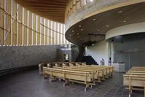 Der gerundeten Form des mit Sonnenlicht durchfluteten Kirchenschiffes folgend, stehen die Sitzbankreihen, die auf den mittig liegenden Altar ausgerichtet sind. Die Mauern im Sockelbereich sind mit Platten aus offenporigem Konglomeratgestein verkleidet, darüber erheben sich die schlanken, glatten Holz-Leimbinder. Zwischen den einzelnen Rahmen ist vollflächig verglast, wodurch es zu einer hellen, freundlichen Atmosphäre in der Halle kommt.