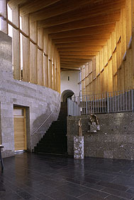 Die Dachfläche dieser „Reifarchitektur“ weist die annähernd gleiche Neigung wie der Hang auf, wodurch die dynamische Höhenentwicklung am Baukörper sehr gut ablesbar wird. An der tiefsten Stelle am nordseitigen Hauptscheitel der Ellipse weicht die geschwungene Außenhaut konkav zurück, um einem Baumriesen genügend Platz zu lassen. Gleich daneben liegt der überdachte Zugang zum ovalen Kirchenareal, und nun hat der Besucher die Wahl, ob er rechts über die gedeckte Treppenanlage bergan zum Innenhof beziehungsweise zur „alten Kirche“ schreiten möchte, die, teilweise erhalten, jetzt als Aufbahrungshalle für den nahen Ortsfriedhof dient oder links den eigentlichen Kirchenraum betritt.