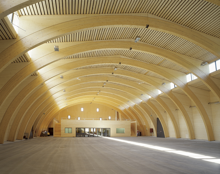 Montags trafen sich die Viehhändler und Bauern jeweils in der Kälberhalle zu Liechtensteig zum Markt. Diese bald hundertjährige Tradition findet nun in der Markthalle von Wattwil ihre Fortsetzung. Solide steht der fast 80 Meter lange Bau am Ortsrand. Die Längswände sind leicht schräg gestellt, sodass der Bau ‹mit beiden Beinen auf dem Boden zu stehen scheint. Unter dem Kleid aus groben Brettschindeln und der Stülpschalung verbirgt sich eine Reihe von gebogenen Bindern aus Brettschichtholz, die dem Raum eine sakrale Note geben. An der einen Schmalseite bildet ein vorstehender, mit wenigen Fenstern durchbrochener Gebäudeteil einen massiven Rücken. Hier ragt auch das Restaurant mit der Tribüne auf dem Dach in die Halle. Am anderen Ende ist der Holzbau scharf abgeschnitten und die Aussenwand zurückgesetzt, sodass ein gedeckter Vorbereich entstand. Das gesamte Baumaterial – fast ausschliesslich Fichte – stammt aus dem Toggenburg. Hochbetrieb herrscht übrigens nicht nur beim Kälbermarkt. Der Blick in den mit Schlachtviehmarkt, Stierenmarkt, Braunviehauktion, Churfirstenfestival und schliesslich auch der Toggenburger Misswahl dick bepackten Kalender zeigt: Die Markt- ist auch eine Mehrzweckhalle.