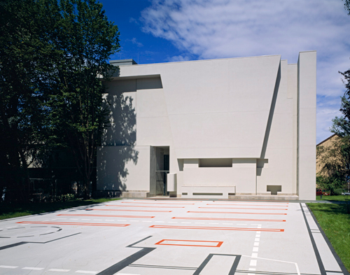 Mit der Art der Behandlung des Platzes vor der neuen Südwand der von 570 auf 260 m² verkleinerten Kirche verdichten und transformieren Meixner Schlüter Wendt geschichtliche und alltäglich Spuren zu einem polyvalenten Referenzraum. Die asphaltierte Fläche entspricht der Grundfläche der Kirche, wie sie hier stand, bevor sie rückgebaut wurde. Die Zeichnungen auf dem Boden zeigen an, wo früher Kirchenbänke standen, wo der Eingang lag, wo eine Wendeltreppe auf die Empore führte. Hier sind Gottesdienste im Freien möglich. In Form und Farbgebung hat die Zeichnung auf dem Boden aber den Charakter von Verkehrszeichen auf Strassen oder von Markierungen auf Sportfeldern - der neue öffentliche Platz, seine profane Inanspruchnahme und seine Geschichte werden einander überlagert (siehe Titelbild). Die Zeichen drücken Geschichte und neu geschaffene Qualität aus. Die inzwischen dazugekommenen Schleifspuren der Skater sind den Architekten daher auch höchst willkommen, denn sie verstärken genau diesen ambivalenten Charakter des Ortes.