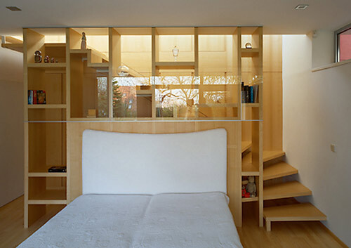 Ein oberlichthelles Waschbecken auf Eschenmobiliar bildet den Auftakt zu Elternbad und beidseitig verglastem Brückenbau. Schlank längsgelegt ruht die Wanne auf der Holzstauwand neben der lichtdurchlässigen Stiege am raumhohen, transparenten Regal ins Schlafzimmer. Das Regal ist Teil der Treppe, Raumteiler und Stauwand von skulpturaler Qualität zugleich und bietet dem Bett mit Gartenblick Rückhalt.
