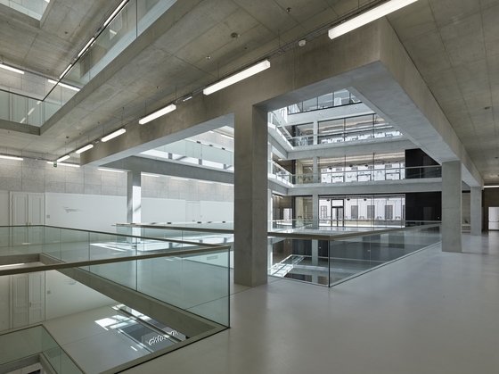 Der Noblesse der Aussenform entspricht der Innenausbau: Die horizontale Empfangshalle verweist ebenso wie das grosse Treppenhaus mit dem dramatisch inszenierten Lichtschacht auf die Eleganz der Ladengeschäfte von Stürm und Wolf. Über fünf Geschosse verteilt, sind 400 Arbeitsplätze in hellen Grossraum- und Einzelbüros untergebracht. Die sorgfältige detaillierte Ausarbeitung setzt sich durch alle Räume fort bis hinauf zur Cafeteria und zum Gymnastikraum in der Attika. Dabei zeigt sich, dass die für die Zwinglistadt so typische Formenstrenge durchaus mondäne Züge annehmen kann.