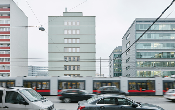 Das von horizontalen Bändern aus Burgunder Kalk und grünem Glas zusammengehaltene Gebäude changiert zwischen Steinhaus und Glaspalast. Seine neun unterschiedlichen Fassaden suchen den Dialog mit der Umgebung. Von der Langstrasse her erblickt man zunächst einen gedrungenen Steinturm, dessen Fundament durch die Tiefgarageneinfahrt gefährlich unterhöhlt wird. Die optische Zäsur einer keilartigen Kerbe trennt ihn von der strassenseitigen Fassadenflucht: einer fast immateriell wirkenden «Glaswand», die sich der dynamisch über Eck gezogenen Fensterbänder wegen in der Unendlichkeit des Himmels zu verlieren scheint.