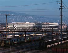 Das von den einfahrenden Zügen aus nicht zu übersehende Gebäude, in dem sich Themen wie Stadt, Raum, Licht und Sicht zur architektonischen Form verdichten, erhebt sich - eingeklemmt zwischen dem Geleisefeld und einer Allee - auf einem dreieckigen Grundstück. Es ist der erste Teil der 1990 durch einen Wettbewerb entschiedenen Bebauung eines abgewirtschafteten, früher in gewissen Kreisen «Bronx» genannten SBB-Areals. Der messerscharf geschnittene Bau, der sich von den sachlichen «Crèmeschnitten» der sechziger Jahre durch einen komplexen Grundriss und sorgfältigere Proportionierung unterscheidet, setzt ein Zeichen im multikulturellen Industriequartier, das heute mit neuen Kinos, Bars und Galerien ein vorab junges Publikum anzieht.