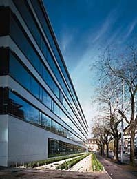 Die Blitzform des aus dem dreieckigen Sockelgeschoss wachsenden Bürohauses erinnert entfernt an das Jüdische Museum von Daniel Libeskind, leitet sich aber ab aus der Komposition der zwei zur Bahn und zur Strasse hin parallelen Baukörper, die miteinander verbunden sind. Daher hat das Haus mit Dekonstruktivismus ebensowenig gemein wie mit der gegenwärtig so erfolgreichen Schweizer Kiste. Vielmehr muss man die skulpturale Grossform, bei der sich Stürm und Wolf auf Ieoh Ming Peis Stadtverwaltung in Dallas und die Erweiterung der Washingtoner National Gallery, vielleicht aber auch auf Sizas Kunstmuseum in Santiago de Compostela bezogen, im erweiterten Kontext des Gesamtprojekts sehen. Dieses umfasst neben dem aus einer gesprengten Hofrandbebauung entwickelten Bürohaus noch neun siebengeschossige Wohnkuben, um deren plangetreue Realisierung die Architekten gegenwärtig ringen.