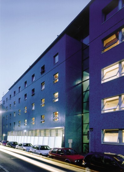 Er nennt sich „Gästehaus der Wiener Universitäten“, der kleine Neubau in der Wiener Tigergasse. Und er behauptet sich in höchst beengten, eben typisch innerstädtischen Verhältnissen, die obendrein keinen einheitlichen architektonischen Charakter mehr haben. Da kann man ganz leicht ablesen, wann eine Lücke im gründerzeitlichen Raster geschlossen wurde . . . Insofern ist er jedenfalls ein Highlight im Straßenbild, der Neubau aus dem Architekturbüro Schwalm- Theiss. Seine grünlich beziehungsweise bläulich schimmernde Glasmosaik-Fassade - ein eingeschnittenes, gläsernes Stiegenhaus gliedert den Bau - setzt einen spannenden Akzent, ohne sich aber unbotmäßig vorzudrängen.