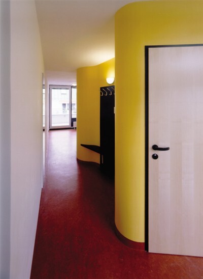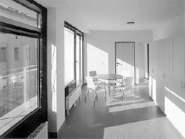 Schwalm-Theiss ist, aus dieser Perspektive betrachtet, ganz der konservative Pragmatiker. In des Wortes positiver Bedeutung allerdings. Er hat sich offensichtlich überlegt, was man als Architekt bieten muß, damit sich die Nutzer in der gebauten Hülle wohl fühlen können. Das heißt, er hat Zimmer gebaut, in denen man schlafen und arbeiten und zur Not auch noch einen Besucher empfangen kann, außerdem Gemeinschaftsbereiche, die auf einem keineswegs überzogenen, sondern auf einem vertretbaren Minimallevel Komfort bieten.