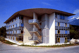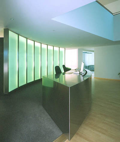 Das Hauptinteresse von Cruz & Ortiz galt den Baukörpern und den dazwischenliegenden Freiräumen, deren kompositorische und soziale Aspekte sie seit ihrem ersten Patiohaus faszinieren. Da das Innere eines Verwaltungsgebäudes der gestalterischen Phantasie Grenzen setzt, lebten sie diese am Aussenbau aus. Die rational komponierten Hoffassaden scheinen die strenge Geometrie der Gartenarchitektur zu reflektieren: Grün schimmernde Quarzitmauern rahmen zwei schwebende Curtain walls aus bläulich eingefärbtem Glas und Aluminiumprofilen, die eine Ikone der fünfziger Jahre zitieren: das Lever House von SOM in New York.