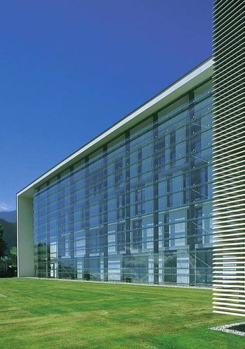 Die der Stadt zugekehrte Gebäudeseite ist komplexer: Da schiebt sich ein eigener Gebäudeteil aus dem Haus heraus, im übrigen signalisiert ein Glashaus Transparenz, Offenheit, also ganz das heute gängige Vokabular. Wir verlassen den trendigen Jargon bei diesem Bau nicht, er erfährt aber hier eine eigenständige, spannende Interpretation. Die Glashaut zum Beispiel erstreckt sich fast über die gesamte Länge des Riegels. Diese Maßnahme nimmt zwar nur unmerkbar, aber umso delikater räumliche Gestalt an. Denn eine spezifische Formulierung des Eingangs, ein Portal oder ein Vordach, haben sich die Architekten so erspart. Man versteht allein durch die Architektur, wo es hineingeht.