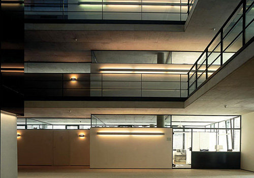 Das langgestreckte, dreigeschoßige Haus wendet dem Flughafen eine ziemlich harte, dennoch gegliederte Fassade zu. Dahinter liegen Büros, und die Architekten sahen keinen Anlaß, die Achsenwirklichkeit dieses Innenlebens zu verschleiern. Durch die Lichtbänder oben und die Lichtschlitze seitlich der Betonelemente, die hier den Rhythmus der Fassade angeben, sind sie jedenfalls wunderbar belichtet. Die Betondecken schieben sich aus dem Baukörper als scheinbar „überzogene“ Geste überdeutlich heraus, was die horizontale Gliederung des langgestreckten Gebäuderiegels betont. Obendrein ist dieser scheinbare Ästhetizismus auch ganz pragmatisch begründet: Er bietet ein Minimum an Beschattung und löst die Vorgaben der Feuerpolizei in bezug auf den Brandüberschlag ein.
